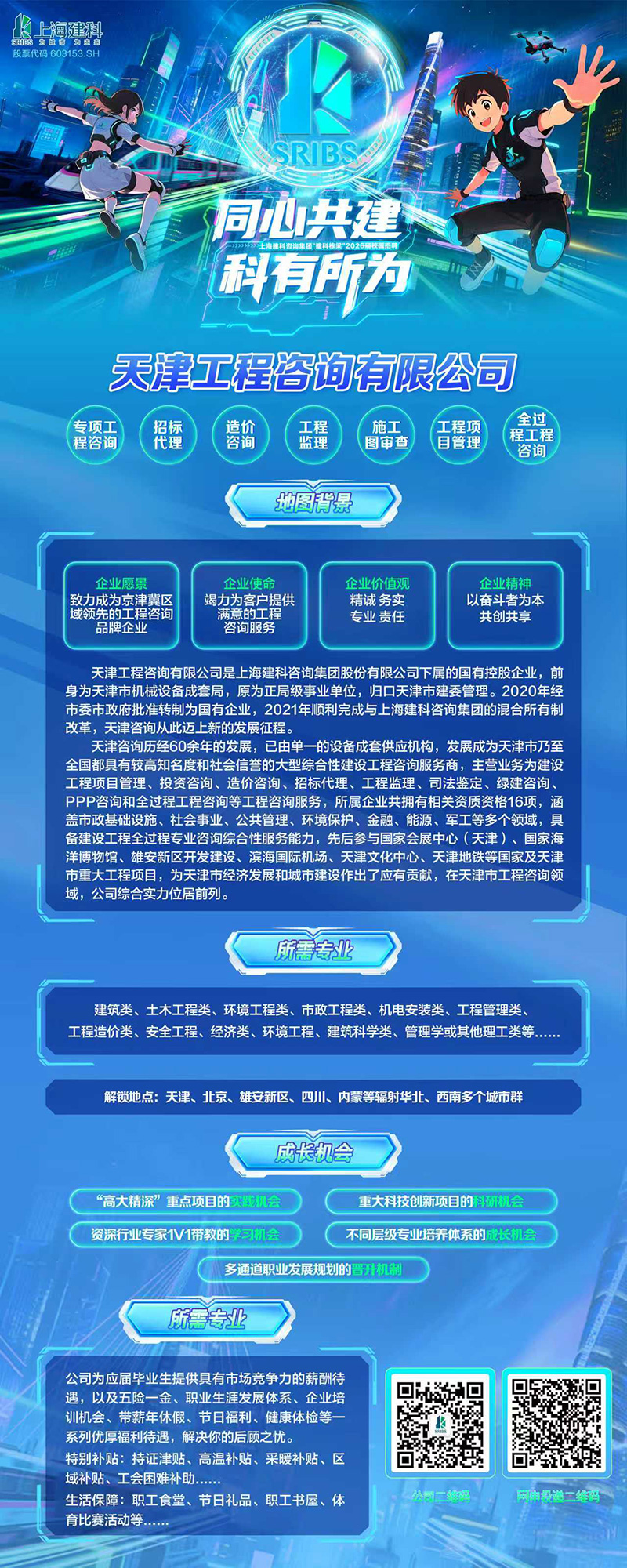 同心共建 科有所为天津工程咨询有限公司启动2026届校园招聘 更新时间:2025-10-22 点击:58 所属栏目:公司新闻 诚邀2026届毕业生参加城市专场宣讲会(天津大学) 简历投递方式 邮箱:tec_hr@sribs.com 电话:022-88365660 “我与天津咨询的相遇” 2026届校园招聘主题vlog