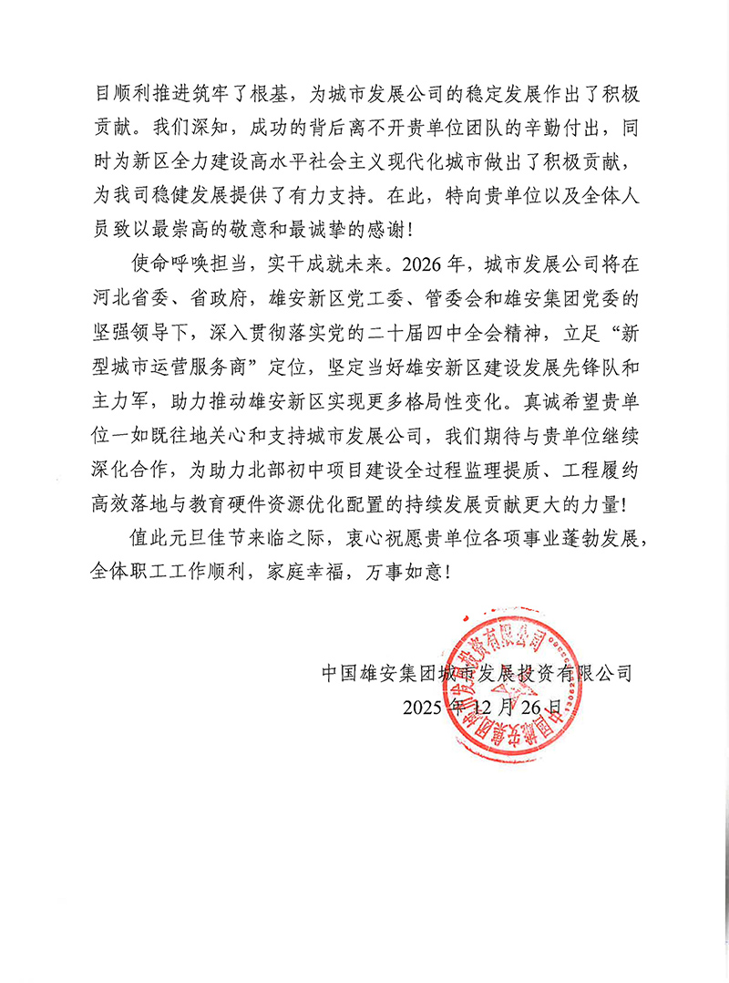 雄安集团城发公司发来感谢信,对天津咨询在雄安新区实现“上台阶”年之际,在北部初中、大学城配套二期项目监理全过程中,以高度责任感和使命感,严控质量安全进度,精准监督施工细节、及时协调突发问题,以专业、严谨、高效筑牢项目根基,为新区建设添力。