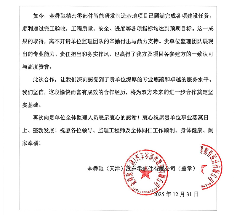 天津华勘穗金房地产公司、中同银龙(天津)公司也先后发来表扬信,对天津咨询河东金贸产业园区11-D、15号项目团队和中同银龙(天津)灭菌中心建设项目的监理工作予以表扬感谢,认为我司项目监理部积极主动对接业主需求,沟通协调参建各方,过程中加强技术管理支撑和质量安全风险防控,用“事事落地、件件闭环”的担当,筑牢项目落地的责任防线,用实际行动诠释了优质监理服务的内涵。