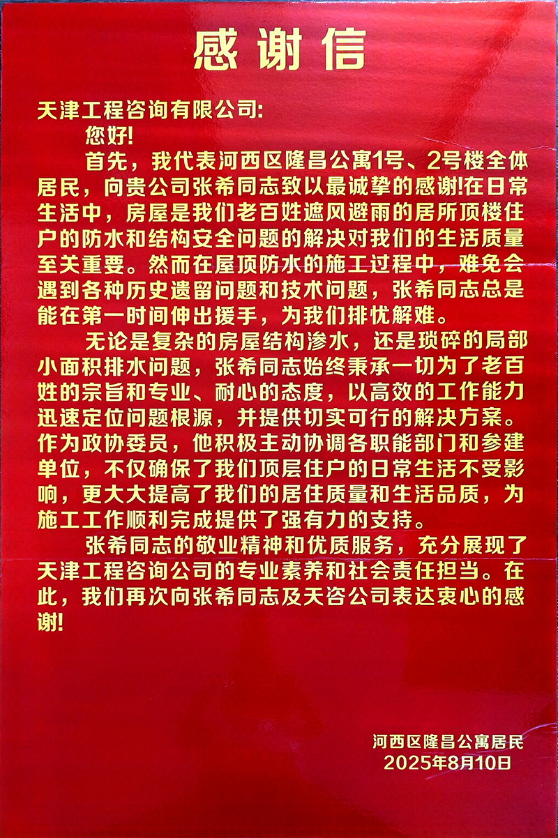 为有效促进工程进展,项目团队主动加强与居民、街道和社区的多层次沟通。在各小区设立联络点,及时公开施工与监理信息,迅速响应居民关切。如隆昌公寓屋面渗水问题,团队仅用三天便协调解决,展现出高效务实的作风。施工前主动告知计划,协助居民做好防护,合理安排作业时间避开休息时段,还为年长体弱居民提供搬运帮助。这些细致入微的服务赢得了居民的广泛赞誉,特地送来感谢信,表扬团队“专业、耐心、高效”。