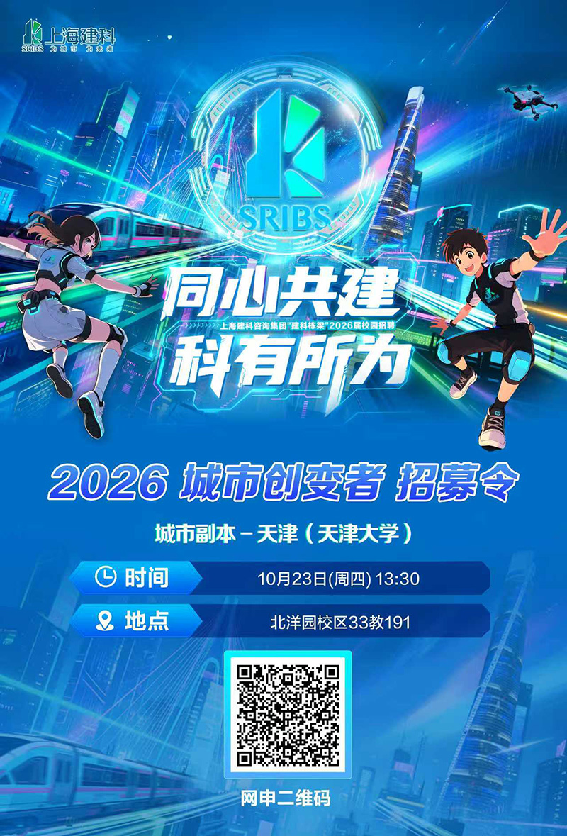 同心共建 科有所为天津工程咨询有限公司启动2026届校园招聘 更新时间:2025-10-22 点击:30 所属栏目:公司新闻 诚邀2026届毕业生参加城市专场宣讲会(天津大学) 简历投递方式 邮箱:tec_hr@sribs.com 电话:022-88365660 “我与天津咨询的相遇” 2026届校园招聘主题vlog